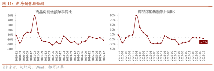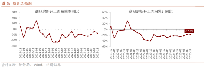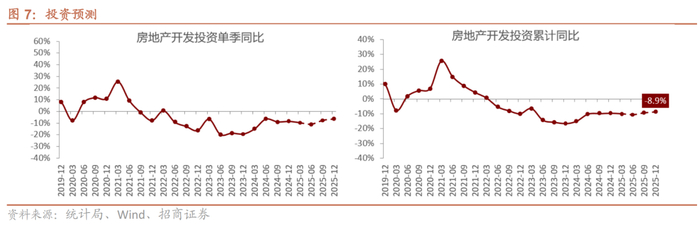 投资方面,考虑到施工面积的持续收缩对投资的影响更为明显,以及过去一段时间销售市场热度回升对施工强度及土地购置意愿等的提升或相对有限,当前阶段房企或仍以去库存为主要目标,预计25年投资累计同比为-8.9%,较25年年度策略预测值负增速略有扩大。