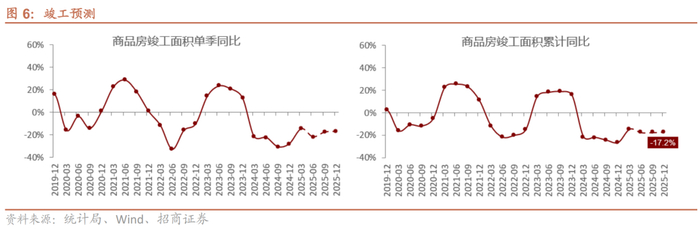 竣工方面,从销售对竣工约2年的领先作用观察,考虑到23年销售数据在小阳春阶段性回升后持续回落,判断25年下半年竣工同比或处于低位震荡过程中,预计25年竣工同比-17.2%,与25年年度策略预测值基本一致。