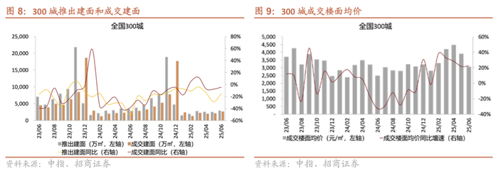 2025年1-6月300城累计成交面积同比-5%,同比降幅较2024年全年扩大11 PCT;累计成交均价同比+33%,在2024年全年-10%的基础上转正。