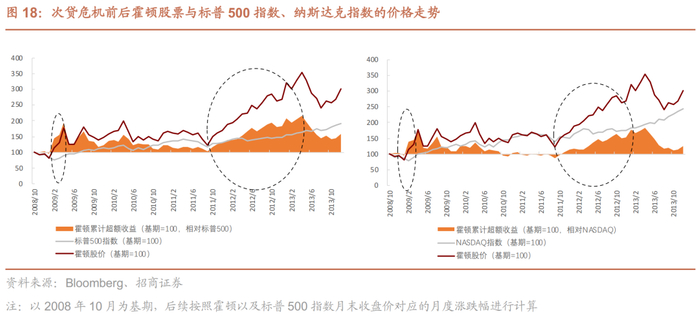 美国次贷危机后,主要房企股价早于二手房价格底部三年筑底,基本同步于新房价格底部,背后原因或包括信用预期修复和新房价格企稳。主要房企股价筑底后震荡上行,直至2011年下半年出现上行拐点,开启“主升浪”行情,出现显著且持续的超额收益。从具有代表性的霍顿的股价观察,震荡期间房地产股票多次出现超额收益,随后也会出现“超跌”,但不会跌穿2009年初的底部,直至二手房价拐点临近时,股价出现显著且持续的超额收益。