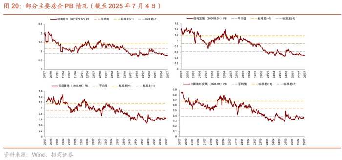 当前主要房企PB估值水平处于近5年来均值向下1-1.5倍标准差位置,接近去年“4.30”和“9.26”两轮股价反弹前的低点水平。当前估值或已体现部分投资人对房地产商业模式的观望情绪。