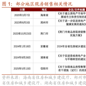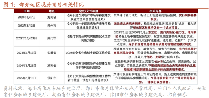 早在2023年1月17日,全国住房和城乡建设工作会议就提出“有条件的可以进行现房销售,继续实行预售的,必须把资金监管责任落到位,防止资金抽逃,不能出现新的交楼风险”。而过去在2024年8月23日国新办新闻发布会上,住建部副部长董建国提出“有力有序推进现房销售,指导地方选择新的房地产开发项目,在土地出让时就约定实行现房销售,结合实践制定配套政策”。随后,2024年12月25日全国住房城乡建设工作会议中提出“大力推进商品住房销售制度改革,有力有序推行现房销售”。地方层面,2025年 5月13日信阳市住房和城乡建设局在《关于加强商品房预售管理工作的若干措施(试行)》中提出“文件印发后新出让土地开发的商品房,一律实行现房销售”。此前,海南省、郑州市、荆门市、安徽省、湖南省等地也曾先后推行现房销售或现房销售试点。