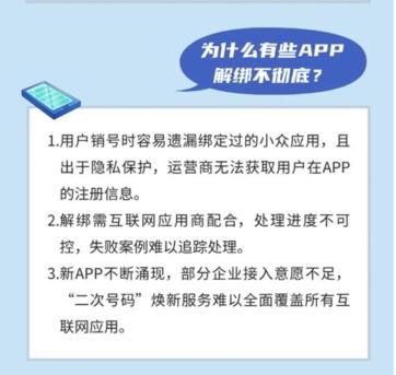 记者留意到,在“二次号码焕新”界面,有一行小字提醒“最终处理方式以应用方处理结果为准”。在官方发布的“二次号码焕新”指南里,也公布了失败的几种可能性,其中就提到,解绑需互联网应用商配合,处理进度不可控,失败案例难以追踪处理。业内人士称,目前的“二次号码焕新”服务,大都是单向的沟通。据悉,运营商收到用户申请后,会将相关信息统一提交至中国信通院码号服务平台,经由平台方向常用互联网应用商提请解绑操作,但这些申请能否被处理、处理是否成功等问题,运营商无法收到反馈。