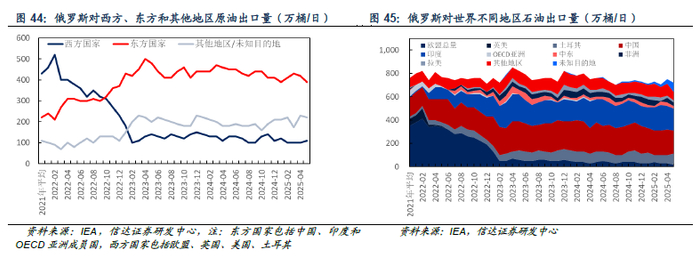 产量方面:2025年5月,俄罗斯原油产量为917万桶/日,环比-10万桶/日,原油剩余产能为63万桶/日,环比+10万桶/日。