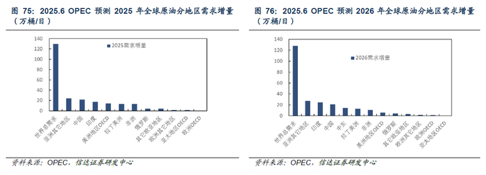 IEA、EIA和OPEC预计亚洲地区的非OECD国家为2025-2026年全球原油需求增量贡献主力。EIA、IEA和OPEC三机构在2025年6月预计2025-2026年亚洲及非洲和拉美地区非OECD国家原油需求将继续带动全球原油需求保持增长,OECD国家需求保持稳定。