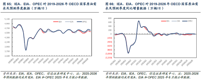 IEA、EIA和OPEC预计2025-2026年OECD国家原油需求保持平稳,但低于2019年疫情前水平。IEA、EIA和OPEC 2025年6月报预期,2025年OECD国家需求分别为4556.9、4559.5、4582.8万桶/日,较2024年分别-9.4、-7.4、+16.2万桶/日; IEA、EIA和OPEC预计2026年OECD国家需求分别为4532.4、4563.4、4590.7万桶/日,较2025年分别-24.5、+3.9、+7.9万桶/日,与2019年疫情前水平仍有差距。