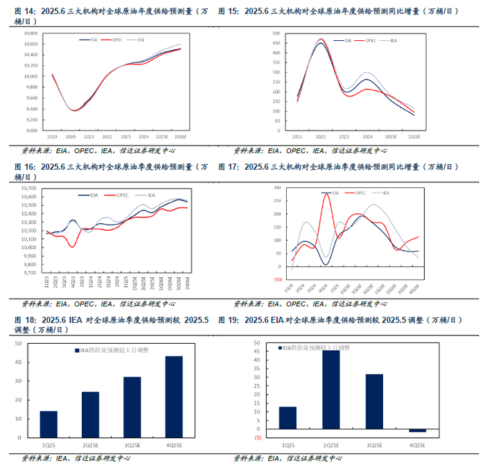 具体来看,2025年6月IEA、EIA、OPEC预测2025Q2全球原油供给同比增量分别+147.64、+146.64、+186.59万桶/日,相较2025年5月预测变化分别+24.23、+45.55、+50.64万桶/日。