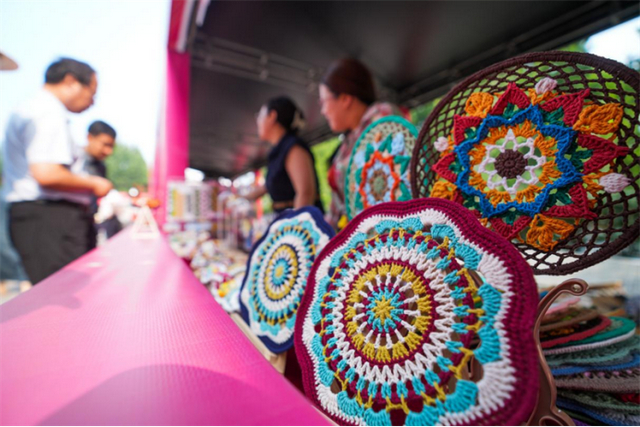 6月28日,在山东省邹平市的夏季“黄河大集”山东手造非遗市集,顾客在购买产品。