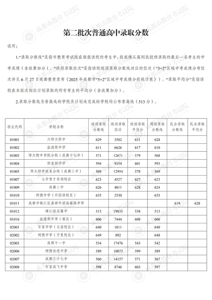 成都市教育考试院按照平行志愿“分数优先、遵循志愿”的投档规则,依据考生志愿和学校招生计划,对中考成绩(含政策加分)在513分(普高线)及以上考生填报的志愿进行了投档录取。“录取分数线”是指成都市教育考试院在填报该校的考生中,按成绩从高到低投档录取的最后一名考生的中考成绩(含政策加分);“统招录取位次”是指该校统招录取分数线对应的位次(“5+2”区域中考成绩分布位次详见6月27日成都教育发布《2025年成都市“5+2”区域中考成绩分段统计表》);“录取平均分”是指该校在本批次相应计划录取的所有考生的平均分(含政策加分)。本批次共录取19982名考生。各学校录取分数情况一览表附后。录取分数线为普高线的学校及计划未完成的学校均公布普高线。