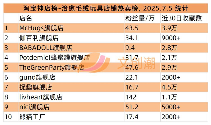 治愈毛绒玩具店铺热卖榜,前五名分别是: