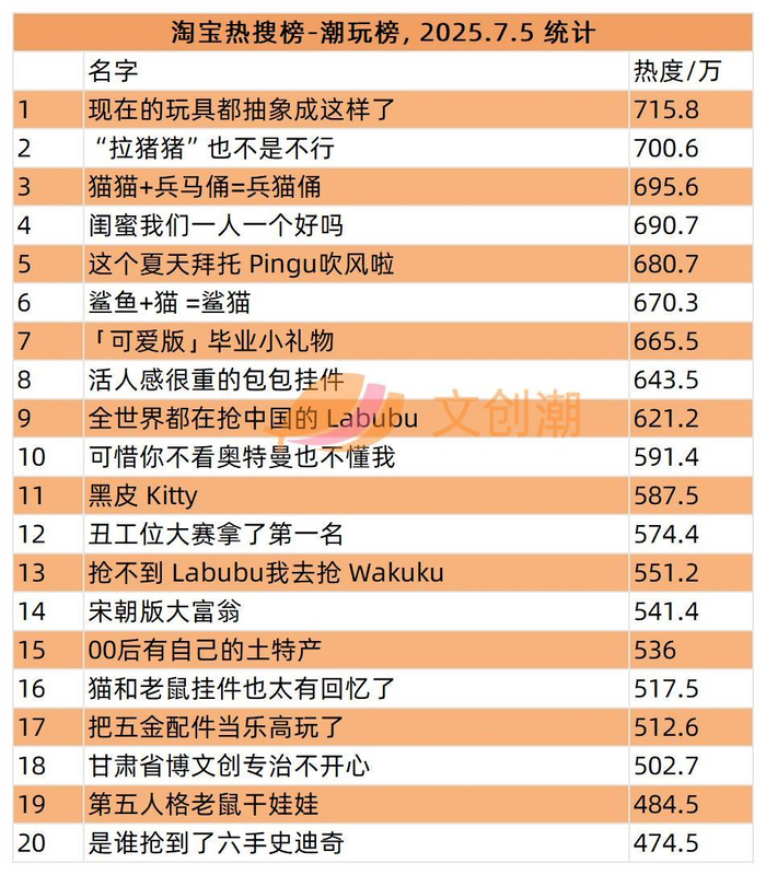 淘宝热搜潮玩榜,每日实时更新,文创潮7月5日统计到的前五名分别是: