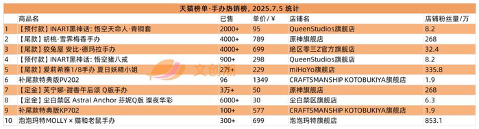 再来看看手办的情况,INART黑神话:悟空天命人·青铜套是榜首。