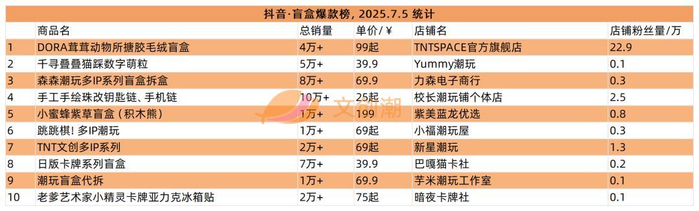 在实时更新的抖音盲盒热销榜,文创潮7月5日统计到的前五名如图所示。