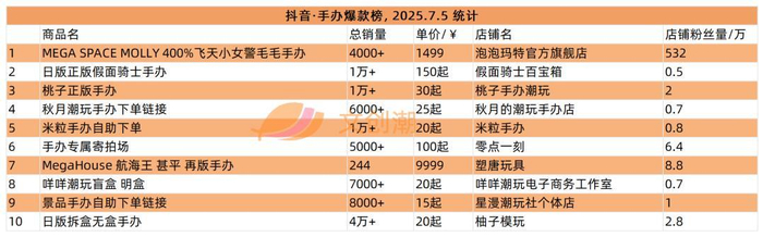 实时更新的抖音手办爆款榜,7月5日文创潮统计时的前五如图所示。