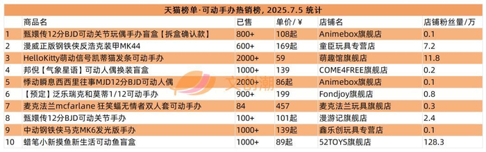 本周文创潮统计到的天猫可动手办热销榜,甄嬛传12分可动关节玩偶在榜首位置。