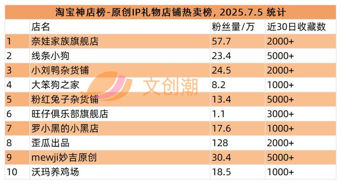 本周统计到的原创IP礼物店铺热卖榜,前五分别是: