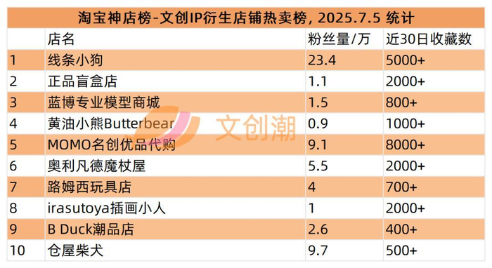 本周统计到的文创IP衍生店铺热卖榜,前五分别是: