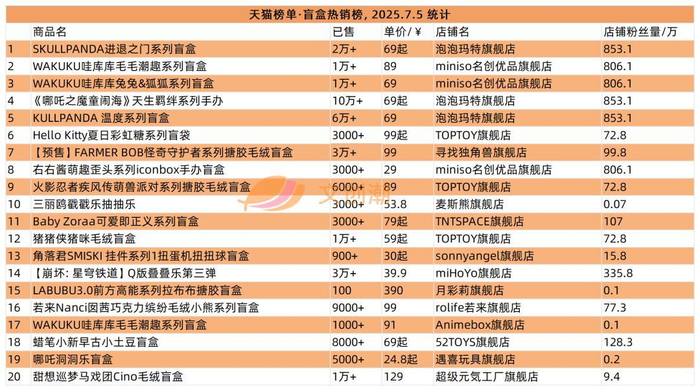 本期天猫榜单盲盒热销榜,前五名分别是泡泡玛特SKULLPANDA进退之门系列、熠起文化WAKUKU哇库库毛毛潮趣系列、WAKUKU哇库库兔兔&狐狐系列、《哪吒之魔童闹海》天生羁绊系列手办、 SKULLPANDA 温度系列。