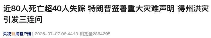 近80人死亡超40人失踪,特朗普签署重大灾难声明,得州洪灾引发三连问