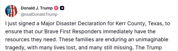 6日早些时候,特朗普在社交媒体上发文宣布,他已签署得克萨斯州克尔县的“重大灾难声明”,此举旨在确保急救人员能立即获得所需资源。特朗普表示,“得州发生了可怕的事情”,他已与得州州长取得了联系。