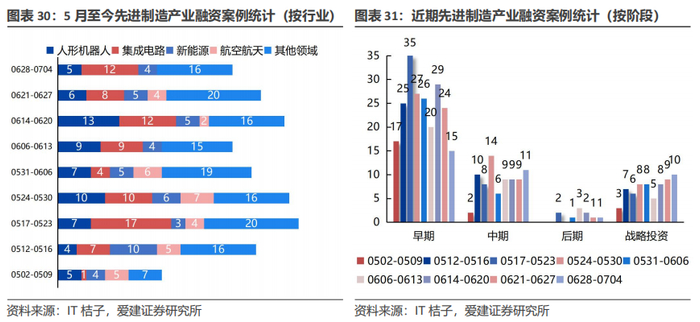 根据IT桔子数据,本周(06/28-07/04)共有37项先进制造相关VC/PE投资信息。1)以产业分类,机器人5项,集成电路12项,新能源4项,其他产业16项;2)以投资轮次分类,早期投资阶段(包含天使轮、种子轮和A轮)共15项,中期投资阶段(包含B轮和C轮)共11项,后期投资阶段(包含D轮至IPO)1项,战略融资10项。