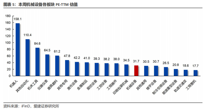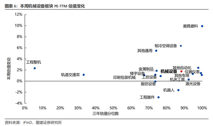 本周(2025/06/30-2025/07/04)机械设备行业PE-TTM估值+0.41%。子板块 PE-TTM 抬升幅度前三子板块为:磨具磨料+6.98%,制冷空调设备+5.03%,其他通用+1.91%;回调幅度前三子板块为:机器人-2.46%,工程器件-1.48%,机床工具-1.35%。