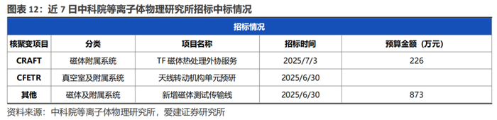 ■可控核聚变:主流核聚变项目建设节奏加快。根据我们对中科院等离子体物理研究所2025年5月至今的招/投标数据统计,我们对中科院等离子体物理研究所2025年5-6月的招/投标数据进行统计,截止至7月4日,共43项招标项目,28项中标项目。近七日(0628-0704)新增招标项目3项,其中磁体附属系统2项,真空室及附属系统1项。随着聚变技术从实验室走向工程应用,超导、热控、高温材料及等离子体测控等关键技术需求持续释放,产业链活跃度有望提升。