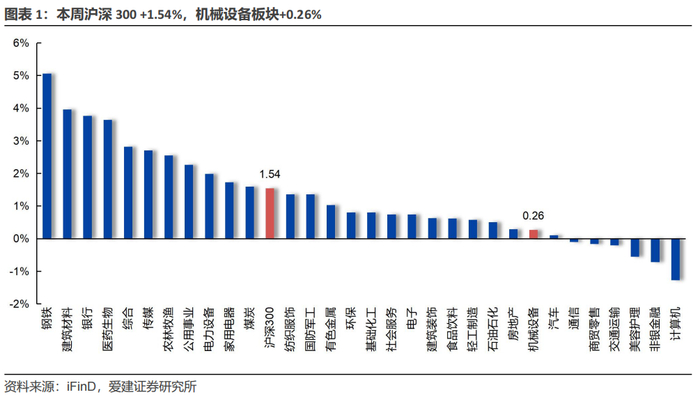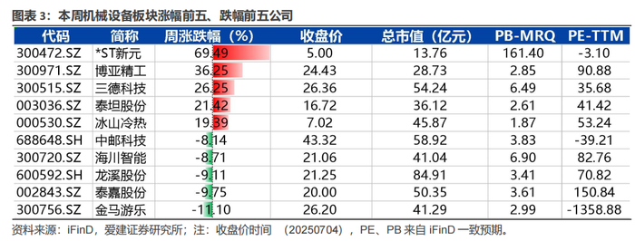 本周机械设备板块中,涨幅前五公司分别为*ST新元(+69.49%)、博亚精工(+36.25%)、三德科技(+26.25%)、泰坦股份(+21.42%)、冰山冷热(+19.39%);跌幅前五公司分别为中邮科技(-8.14%)、海川智能(-8.71%)、龙溪股份(-9.11%)、泰嘉股份(-9.75%)、金马游乐(-11.1%)。