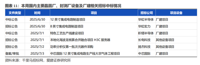 近7日半导体设备及厂建相关招中标数据统计。近7日(0628-0704)国内主流晶圆代工厂和封测厂公开披露6项招标、中标和备案审批公告。3项招标公告:1项厂建项目,2项其他设备项目;2项中标公告:2项厂建项目;1项审批公告:1项厂建项目。