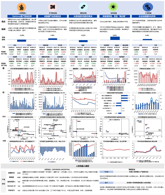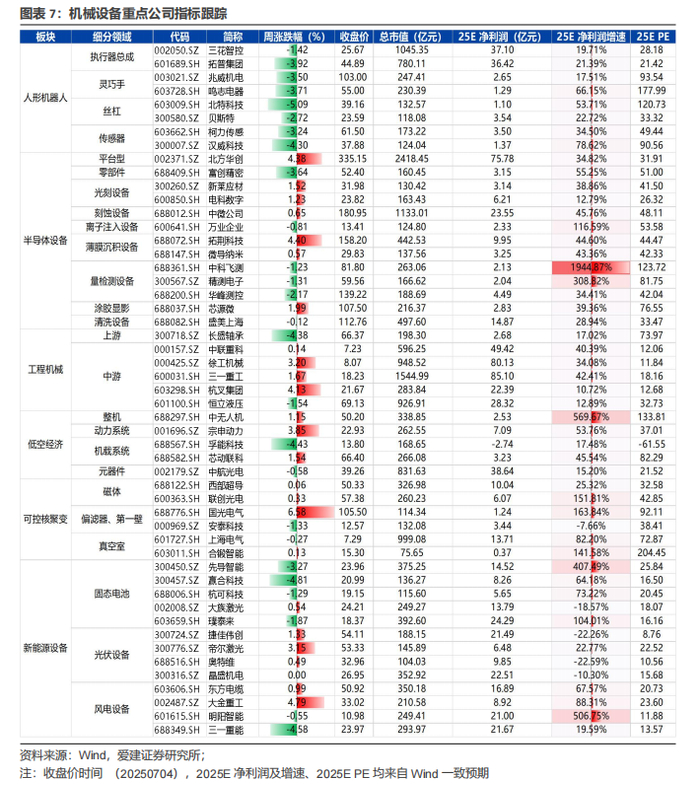 市场表现:本周(2025/06/30-2025/07/04)沪深300指数+1.54%,其中机械设备板块+0.26%,申万一级行业排名24/31位。机械设备子板块中,制冷空调设备+3.48%,表现最佳。