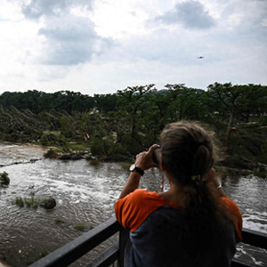 当地时间2025年7月6日,美国得克萨斯州克尔维尔,一名女子在瓜达卢佩河边拍照。此前,该地区在7月4日假日周末期间遭遇严重山洪暴发。本文图片 视觉中国