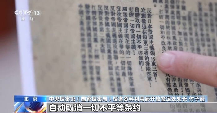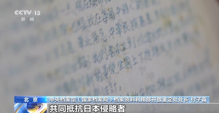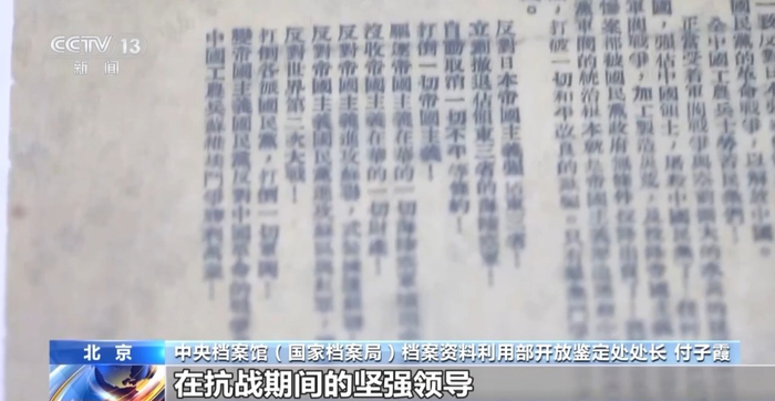 中央档案馆(国家档案局)档案资料利用部开放鉴定处处长付子霞:在这份档案中,我们可以看到中共中央呼吁反对日本帝国主义强占东三省,立刻撤退占领东三省的海陆空军,自动取消一切不平等条约。通过这份宣言,我们可以看到中国共产党明确的抗战主张。