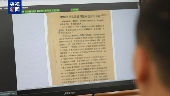 中央档案馆(国家档案局)档案资料利用部开放鉴定处处长付子霞:卢沟桥事变的第二天,中共中央通电全国,呼吁:“同胞们,平津危急!华北危急!中华民族危急!只有全民族实行抗战,才是我们的出路”,通电号召全国军民团结起来,共同抵抗日本侵略者,向全国民众表明了中国共产党抗战到底的决心,发出了战斗的号角。