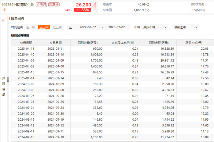 根据东方财富Choice数据统计,药明生物自公布上述回购计划至今,已累计回购股份2.21亿股,累计回购金额40.54亿港元,回购均价18.36港元。按照回购上限6亿美元(47.1亿港元)计算,剩余回购额度仍有6.56亿港元。