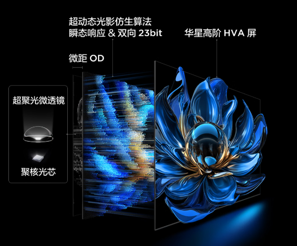 从硬件层面上,万象分区采用了聚核光芯,将蓝宝石高光晶底升级为超能高光晶底,并以ALD原子级耐蚀工艺实现电视亮度与光效的大幅提升。根据官方数据显示,相较行业的普通多芯Mini LED芯片,亮度提升53.8%,光效提升10%。再搭配拱桥控光技术的超聚光微透镜,通过对光线更精准的控制,相较于普通透镜,让光的均匀性提升112%,控光能力提升96%。