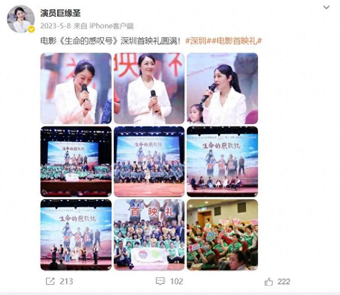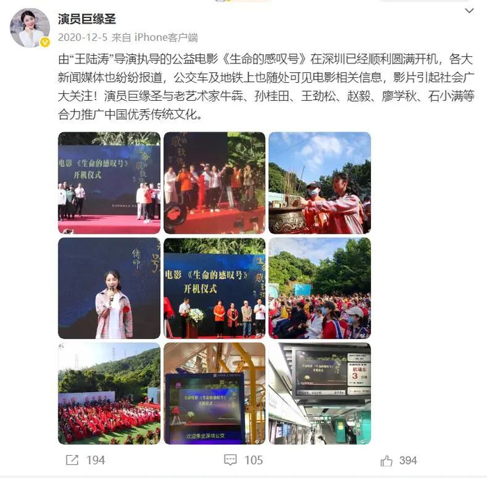巨缘圣最新的两条微博均是关于她曾参演的公益电影《生命的感叹号》,该影片被中国生命关怀协会认定为国内首部生命关怀与安宁疗护题材电影,并获得第十三届澳门国际电影节最佳公益影片大奖。老戏骨孙桂田、石小满也参演该影片。
