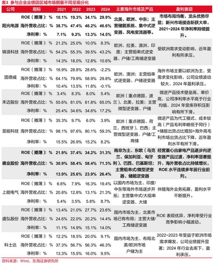 区域市场侧重及产品功率段的差异使得PCS环节参与企业的业绩呈现分化,前期侧重欧洲布局的企业2024年业绩出现不同程度下滑,阳光电源、德业股份等市场布局均衡、在新兴市场具备先发优势的企业盈利表现相对优异。PCS环节中的主要参与者为老牌光伏逆变器企业,各企业在细分市场及产品功率段具备一定差异性。当前行业需求呈现结构性变化,欧美传统市场增速趋缓(欧洲市场前期因能源危机增速较快、近两年基本处于去库状态)、亚非拉等新兴市场需求高度景气且具备延续性(弱电网下的用电保障需求+发达国家资金支持+光储成本下降等),各企业盈利水平因市场布局呈现出分化趋势。具体而言,前期侧重布局欧洲的厂商在经历2022~2023年的业绩爆发期后,2024年业绩均出现不同程度下降;而区域市场布局均衡、在新兴市场渠道积累丰富的企业业绩表现突出,如阳光电源、德业股份等;此外产品功率段差异亦带来企业盈利差,微逆企业产品定位中小功率段(颗粒度较组串/集中式更细)、下游价格敏感度更低,相关企业净利率水平居行业前列,如禾迈股份等。