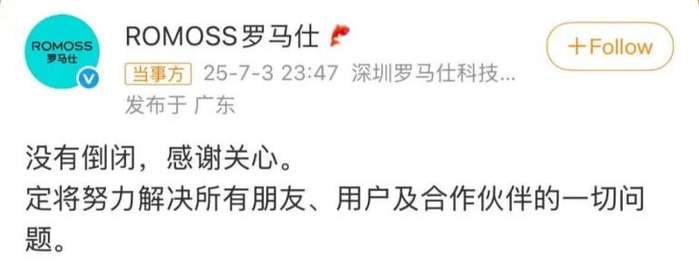 此前,7月3日,罗马仕停工停产的消息曾冲上微博热搜引发热议,3日深夜,罗马仕官方微博发文称:“没有倒闭,感谢关心。定将努力解决所有朋友、用户及合作伙伴的一切问题。”