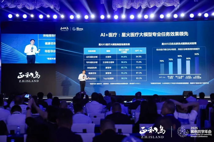在医疗领域,我们的大模型已通过国家职业医师资格考试,超过了99%的考试学生,我们与葛均波院士合作的心内科应用,以及与安徽医科大学校长翁建平教授合作的糖尿病专业应用,均已达到超越主治医师水平的成效。随着深度推理技术的出现,今年的大模型在多个专科领域实现了顶级水平的突破,就是因为有了一种快速的行业训练工具链。
