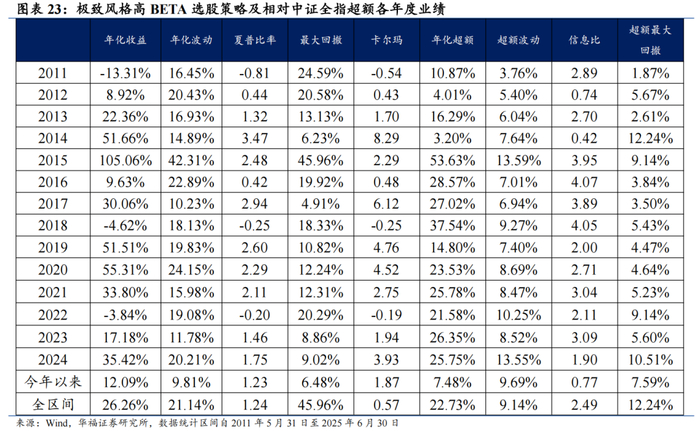 极致风格高BETA组合相对中证全指指数超额收益显著,各年度超额表现相对稳定。从年化收益表现上看,策略取得不错的收益表现,相对于中证全指指数自2015年6月至2025年6月30日年化超额收益22.73%,信息比为2.49。