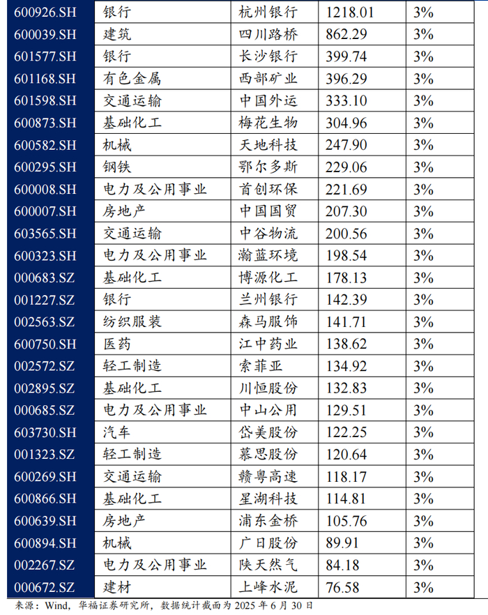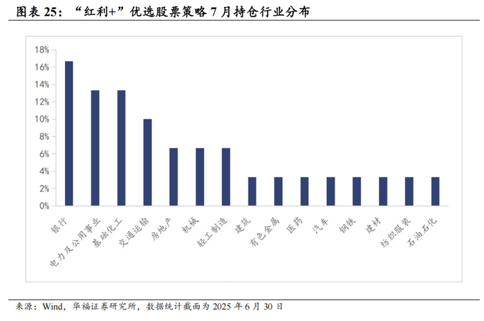 根据模型最新结果,2025年7月红利+选股策略推荐如下表。最新持仓股票平均市值939.21亿元,中信一级行业在银行上分布相对集中,分布占16.7%。其次是电力及公用事业,占到13.3%。