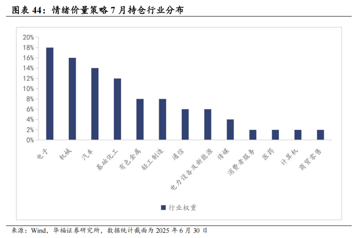 截至2025年6月30日数据显示,7月情绪价量策略推荐如下表,其中包含50只股票。最新持仓股票平均市值151.83亿元,中信一级行业在电子、汽车和机械上分布相对集中,分别占18%、16%与14%。其次是基础化工和有色金属、轻工制造,分别占12%、8%与8%。