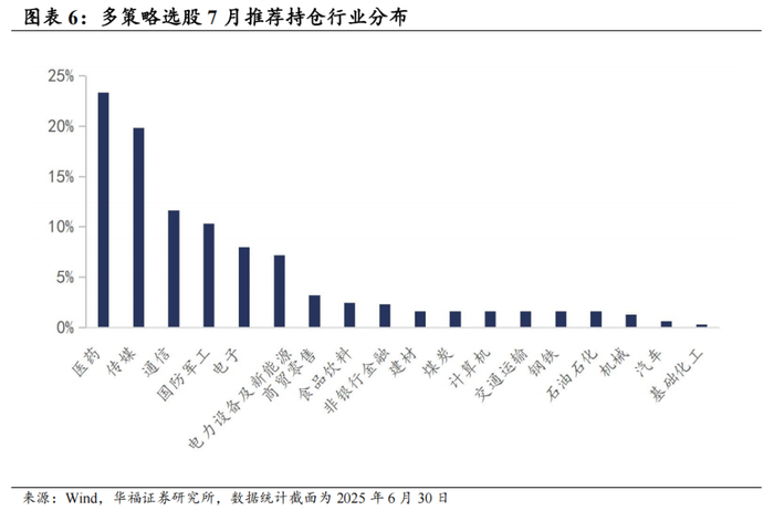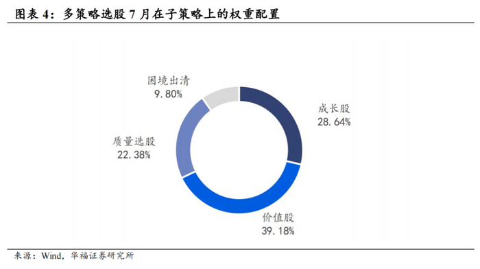 策略在2025年7月对子策略的权重配置在价值股策略权重占比最高,约39.18%,在困境出清选股策略上的权重占比最小,约9.80%。6月多策略选股策略绝对收益4.52%,多策略选股策略相对中证全指超额收益0.52%。