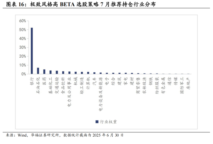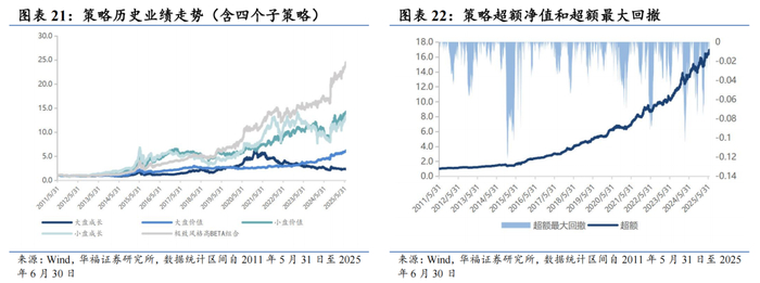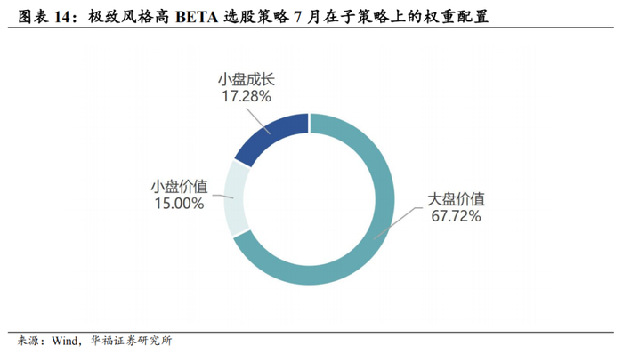 策略在2025年7月对子策略的权重配置在大盘价值策略权重占比最高,约67.72%,在小盘价值策略上的权重占比最小,约15.00%。6月极致风格高BETA策略绝对收益4.18%,极致风格高BETA策略相对中证全指超额收益0.19%。