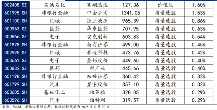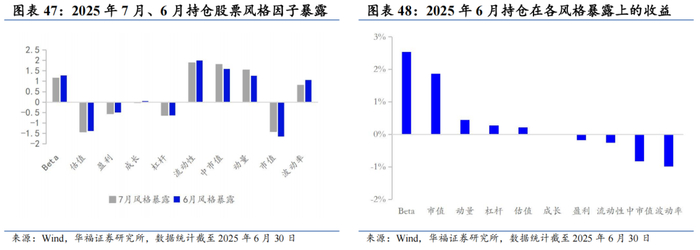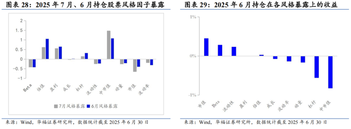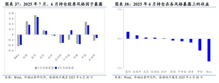 2025年7月份最新持仓的因子暴露情况与2025年6月结构略有不同,在估值、盈利、成长和市值上的正向暴露有所放大,而中市值的暴露则由正转负。持仓在Beta、流动性和波动率的负向暴露有所放大,而在杠杆和动量因子上的负向暴露有所收窄。