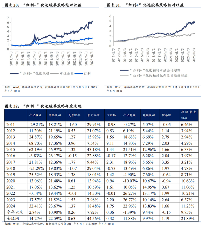 “红利+”优选股票策略组合相对中证全指超额收益显著,各年度超额表现相对稳定。从年化收益表现上看,“红利+”优选股票策略取得不错的收益表现,2011年5月3日至2025年6月30日年化收益14.26%,相对于中证全指年化超额收益11.87%,信息比为1.19,相对于红利收益指数的超额收益为6.89%。