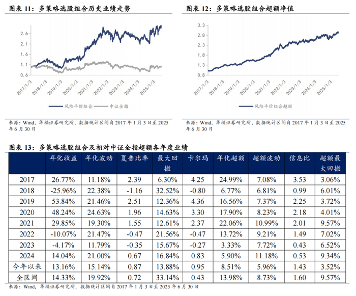 多策略选股策略组合相对中证全指指数超额收益显著,各年度超额表现相对稳定。从年化收益表现上看,策略取得不错的收益表现,相对于中证全指指数自2017年初至2025年6月30日年化超额收益14.33%,信息比为1. 60。