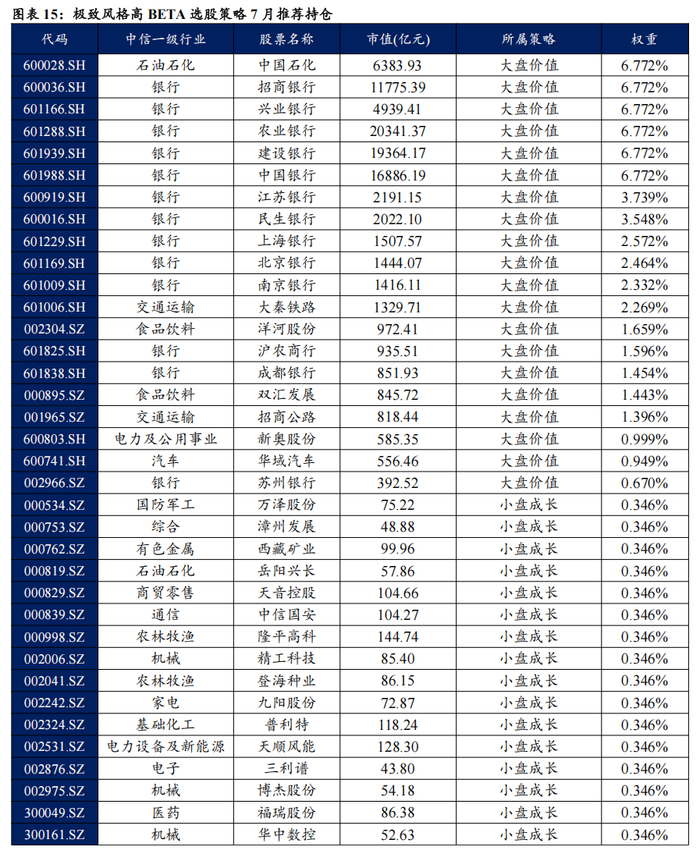 策略7月推荐组合含股票120只股票。持仓的股票在中国石化、招商银行等票上相对集中,占比6.772%。行业分布上,相对集中于银行、石油石化、医药、基础化工、交通运输、食品饮料等行业。最新持仓股票平均市值850.86亿元。