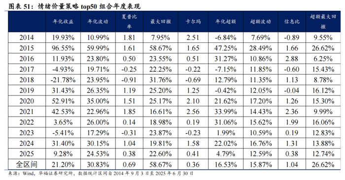 情绪价量策略相对中证全指超额收益显著,各年度超额表现相对稳定。从年化收益表现上看,情绪价量策略取得不错的收益表现,2014年9月3日至2025年6月30日top50组合年化收益21.20%,top100组合年化收益20.76%;相对于中证全指自2014年9月3日至2025年6月30日top50组合年化超额收益16.53%,信息比为1.04,top100组合年化超额收益16.11%,信息比为1.10。
