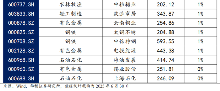 6月,策略绝对收益为1.12%,相对中证全指超额收益-2.75%。今年以来策略绝对收益为-0.06%,相对中证全指超额收益-4.16%。策略持仓合计选入30支股票,主要分布在有色金属、石油石化和钢铁行业,共15支,权重占比为51%,其余分布在通信、基础化工、轻工制造、交通运输、电子、建材等行业,选股主要集中在钢铁板块。